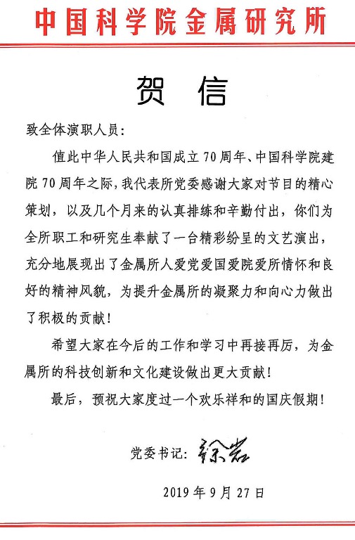演出前,徐岩书记代表所党委和所班子致辞。他指出,新中国成立以来,中国共产党带领全国各族人民取得了举世瞩目的伟大成就,在新中国70华诞即将到来之际,我们欢聚在这里,以文艺演出的方式表达金属所人对中国共产党的无限热爱和对伟大祖国的美好祝福。他强调,金属研究所作为一个有着66年历史的老所、大所、强所,在老一辈科学家和几代人的不懈努力下,现已建设成为材料科学与工程领域国内一流并具有重要国际影响的研究机构,是我国高性能材料研究与发展的重要基地,为国家科技进步、经济社会发展和国家安全做出了一系列重要贡献,祖国科技事业的进步和发展有我们不可替代的贡献!徐岩书记激昂地说:走进新时代,欢歌颂盛世,祝愿伟大祖国更加繁荣昌盛、文明富强!