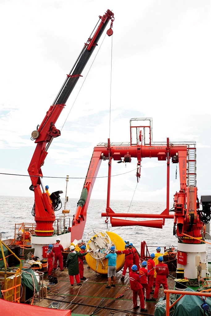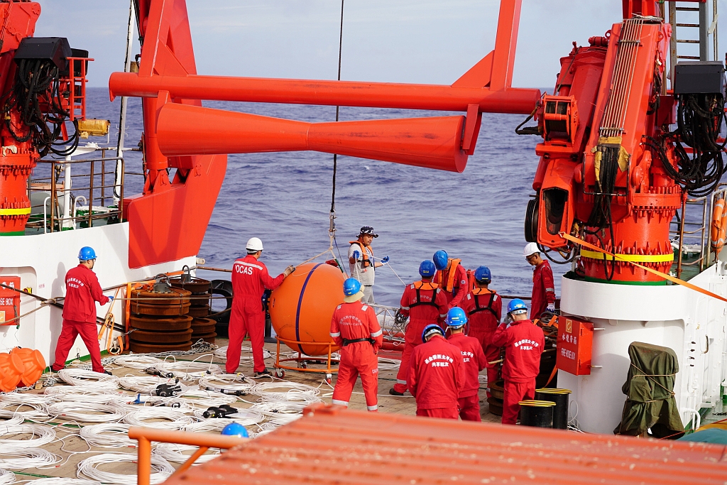 工作人员布放深海潜标