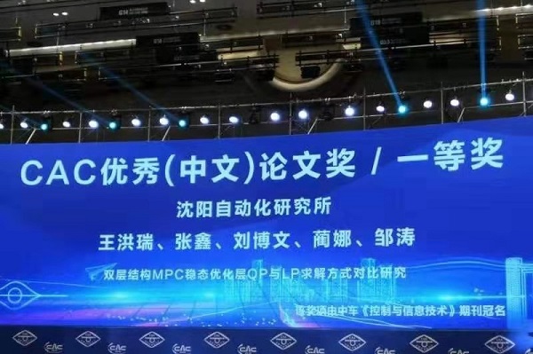 11月22至24日,2019中国自动化大会(CAC 2019)在浙江杭州举行。中国科学院沈阳自动化研究所邹涛研究员等撰写的论文《双层结构MPC稳态优化层QP与LP求解方式对比研究》荣获大会 “CAC优秀(中文)论文奖”一等奖。