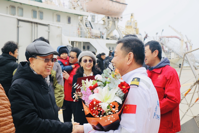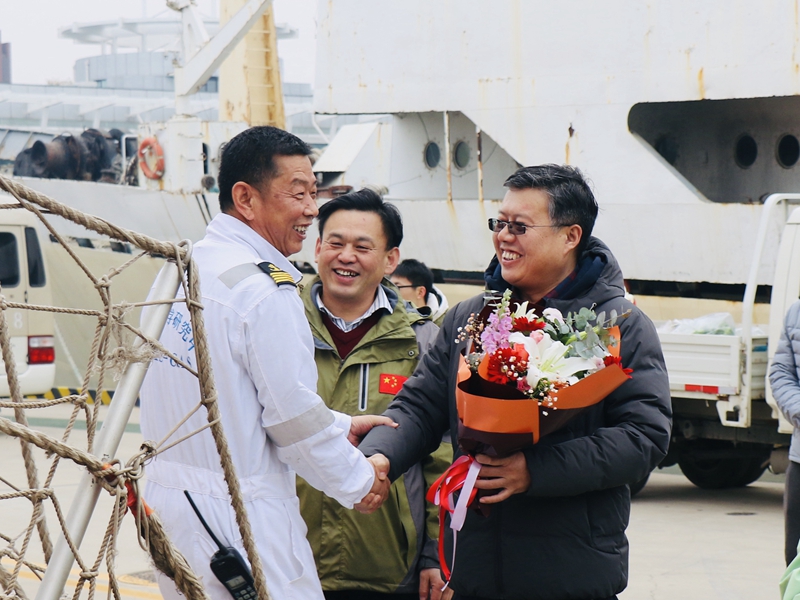 1月5日,“科学”号科考船圆满完成国家自然科学基金委2019年西太平洋开放共享航次科考任务,返回青岛母港。胡敦欣院士、王辉书记以及科考船运管中心负责人、相关部门同事到码头迎接。