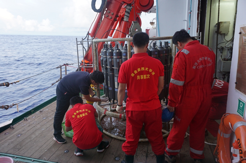 航次搭载的国家自然基金项目在多个前沿领域取得重要进展。中科院海洋所孙虎元研究员首次进行了3000米以深分层海水腐蚀性试验,获得西太平洋5000米深度国产X80钢腐蚀速率的连续观测数据。厦门大学黄邦钦课题组首次在西太平洋沿赤道断面获得了大空间尺度的高分辨率、高灵敏度浮游生物呼吸数据。中科院海洋所郭术津博士首次调查了马里亚纳海沟邻近海域固氮蓝藻的生物量及其垂直分布。中国海洋大学杨桂朋课题组首次对西太平洋海域生源硫化物实现空间大尺度观测?;Ψ洞笱Ю畹兰究翁庾檎攵晕魈S蛏畈闼形⑺芰细炒嫣卣魇褂昧舜筇寤?span>(8吨)原位过滤方法,解决了深海采样体积不足等问题。此外,航次还获取了海洋上1500米层高空间分辨率湍流结构剖面数据,为低纬度西太平洋湍流混合研究提供了重要基础。这些观测将极大地推动我国在西太平洋海洋科学与技术相关领域取得持续突破。