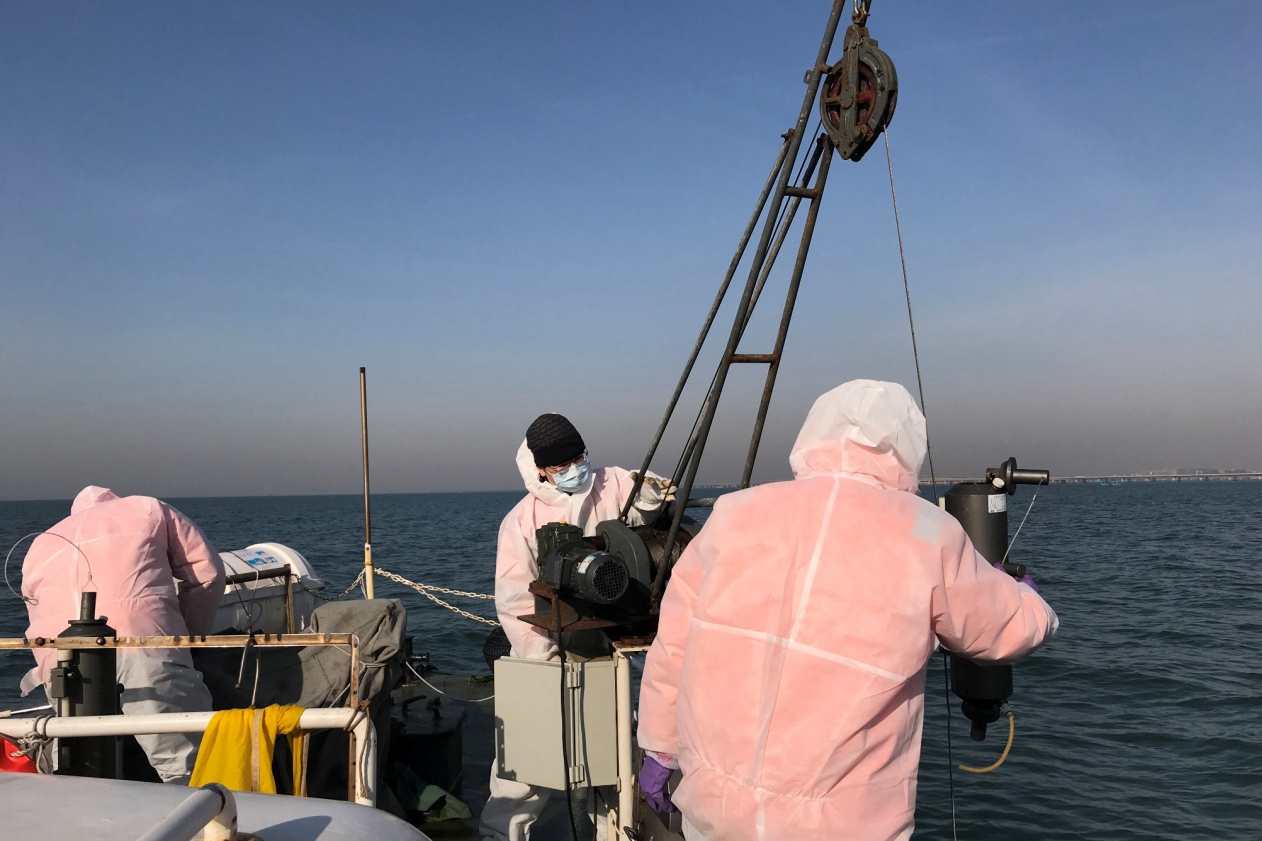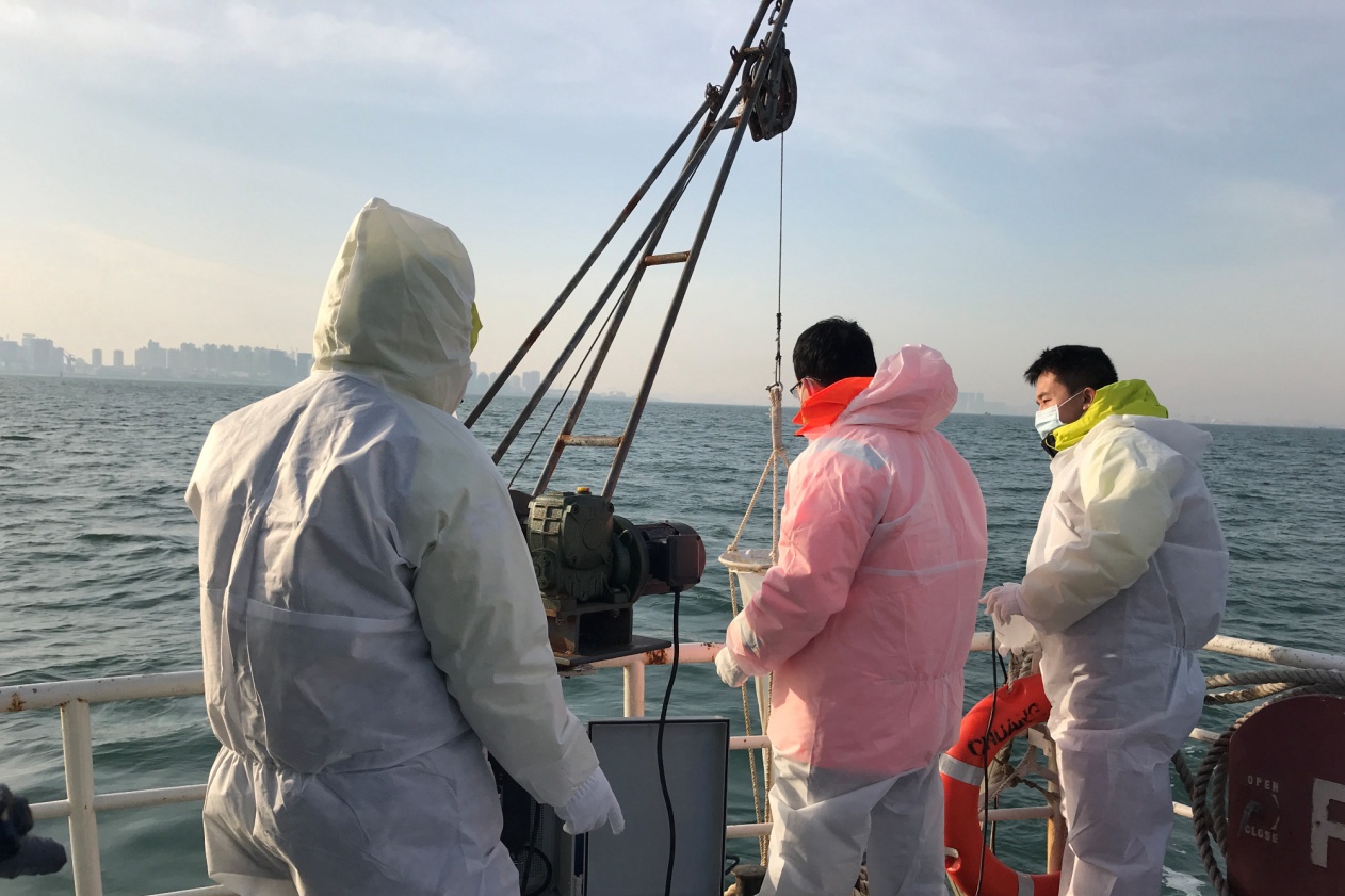 工作人员采集胶州湾海水样品