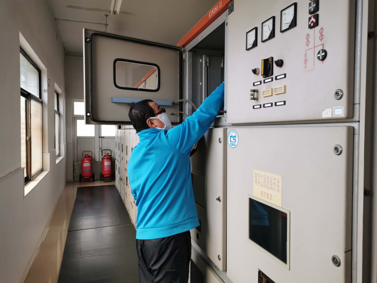 值班人员在变电室检修设备
