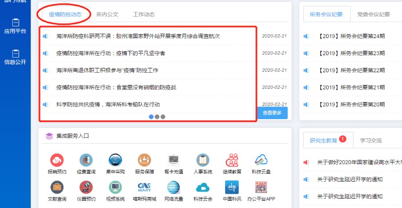 海洋所在所外网设立了“抗击新型冠状病毒 海洋研究所在行动”专题网页,在内网开设“疫情防控动态”专栏,及时通报国家及青岛市最新疫情动态,发布研究所疫情防控通知、防疫举措以及疫情防控的科普知识等,加强防疫宣传,消除恐慌情绪,凝聚起众志成城、全力以赴、共克时艰的战“疫”正能量。