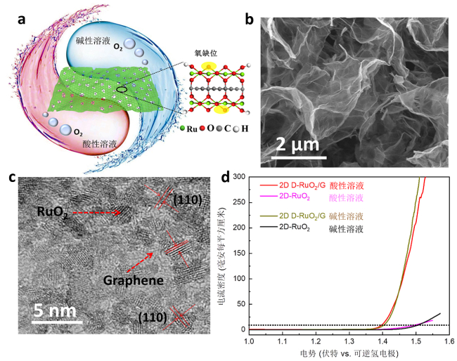 近日,大连化物所催化基础国家重点实验室二维材料化学与能源应用研究组(508组)吴忠帅研究员团队开发出一种具有本征缺陷结构的氧化钌/石墨烯二维异质结催化剂,实现了在全pH范围内高活性、高稳定的电解水析氧。