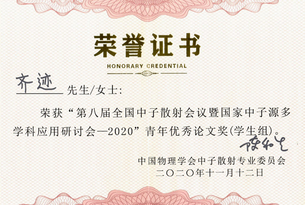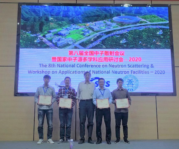 在本次会议期间,中国物理学会中子散射专业委员会组织评选了“青年优秀论文奖”,共有包括我所2019级博士研究生齐迹在内的四位青年人才获此殊荣。中国物理学会中子散射专业委员会主任、中国散裂中子源工程建设总指挥和工程经理陈和生院士亲自为获奖人颁奖并合影留念。