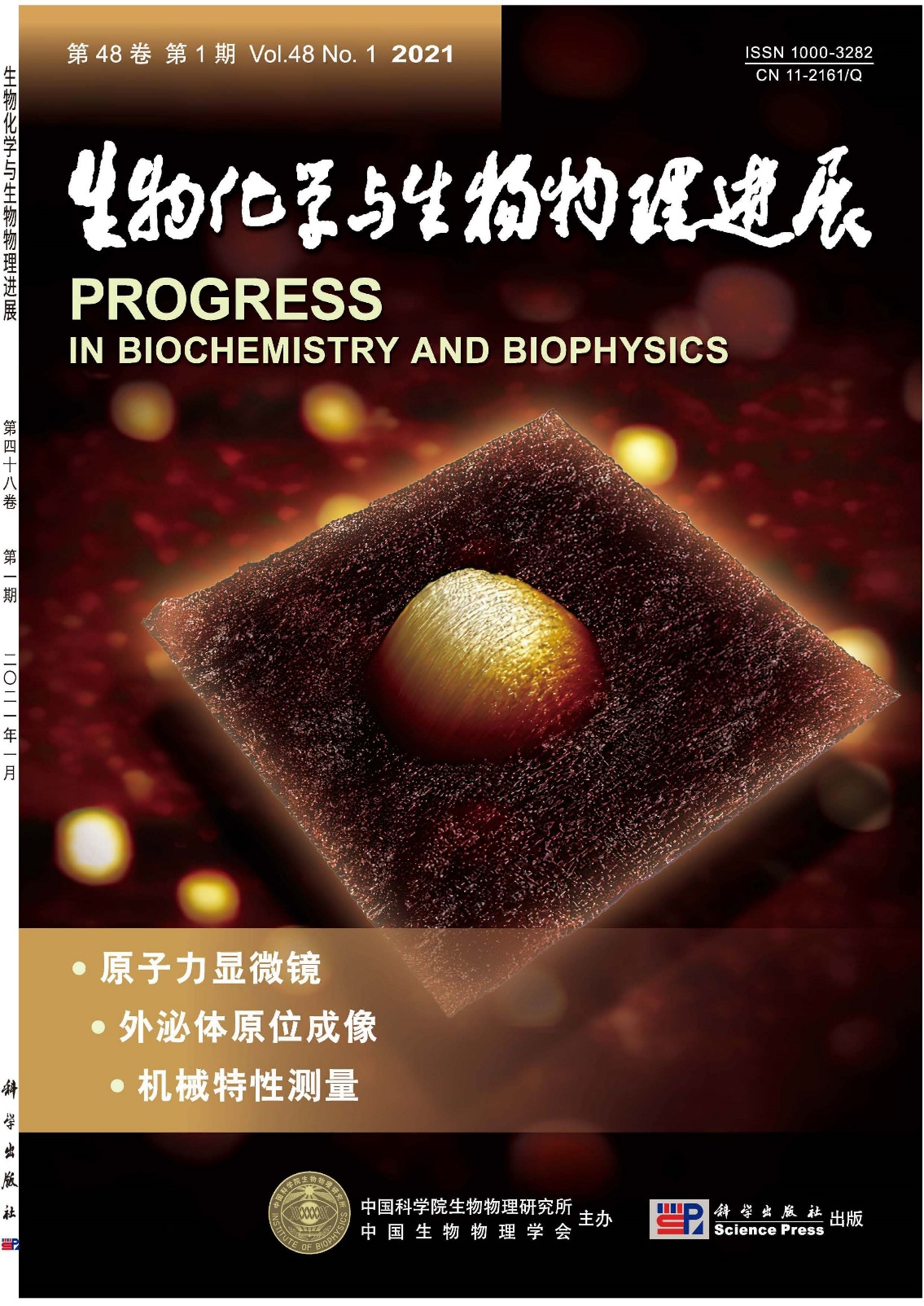 Progress in Biochemistry and Biophysics封面展示了在溶液环境下利用AFM获取的单个活体状体外泌体高质量三维形貌图。外泌体是一种由细胞分泌的直径在40-160 nm之间的囊泡,内含丰富的生物分子以调节细胞生理病理活动过程。研究单个外泌体的结构及行为特性对于认识外泌体的生物学功能及其生物医学应用具有重要科学意义,但由于相关技术手段及方法的缺乏,目前对于单个活体状态外泌体精细结构及机械特性的认知还不足。论文提出了基于静电吸附的外泌体固定方法,在此基础上利用AFM对单个活体状态外泌体的形貌进行了高质量成像,同时实现了对外泌体机械特性的定量测量与可视化表征。研究结果为纳米尺度下活体状态外泌体原位探测提供了新的方法,对于生命科学领域具有广泛的基础意义。