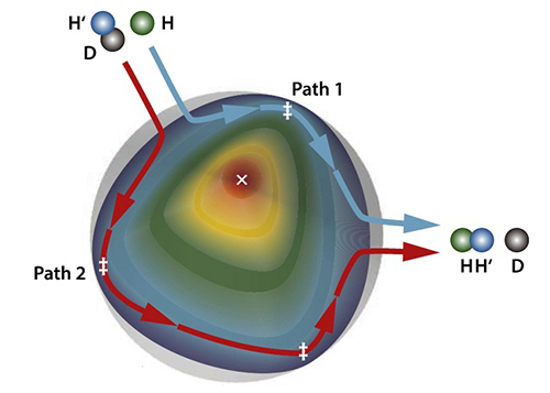 化学反应的进程伴随着复杂的量子力学现象,但其通常难以被直接观测到,因而化学反应的本质亦难以得到透彻的理解。大连化物所院士杨学明、院士张东辉、研究员孙志刚和研究员肖春雷团队提供了一个研究范例。他们研究发现,在H+HD H2+D反应中,在碰撞能量为1.9~2.2电子伏的范围内,产物H2(v’=2,j’=3)的后向散射呈现显著的振荡(其中v’是振动量子数,j’是转动量子数)。通过拓扑理论分析,他们发现该反应存在两条迥然不同的反应路径,振荡是由这两条路径之间的量子力学干涉所产生的。该研究揭示了该反应在较低能量处,量子几何相位效应仍然存在,并可以被观测到。这非常类似于众所周知的Aharonov-Bohm效应,清晰地揭示了化学反应的量子性。