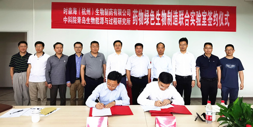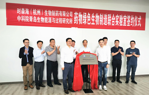 青岛能源所联合时森海(杭州)生物制药有限公司围绕重要药物的绿色生物制造技术开发,打造技术开发与产业化一体化的产研合作平台,共建“药物绿色生物制造联合实验室”,5月17日上午在时森海(杭州)园区举行了揭牌仪式。青岛能源所副所长吕雪峰、知识产权与成果转化处处长陈骁、时森海(杭州)生物制药有限公司总经理黄平共同为联合实验室签约揭牌。时森海董事长白骅、富阳区人大副主任王龙华、富阳区国家级银湖开发区书记许玉钧、副主任吴林明等企业及地方领导参加签约揭牌仪式。