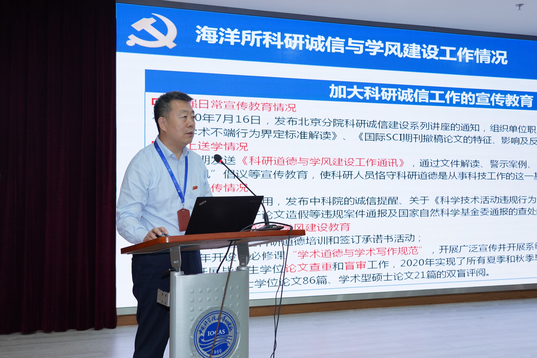 党委副书记、纪委书记毕伟作“加强科研诚信建设,构建良好学术风气”专题报告。报告从8个科研不端行为的警示案例入手,强调了加强科研诚信与学风建设的重要性和紧迫性,介绍了我国科研诚信建设的相关制度建设和中科院科研诚信与学风建设有关情况,结合实际工作通报了海洋所科研诚信建设工作的进展情况,并针对科研诚信的易发重点进行了提醒。毕伟号召全体党员要大力弘扬新时代科学家精神,持续加强作风学风建设,在工作中坚决落实“一岗双责”,为研究所营造风清气正的科研环境。