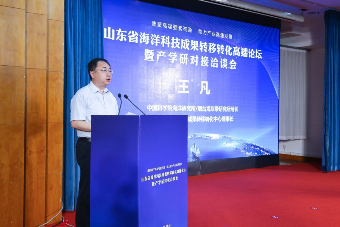 王凡在致辞中表示,海洋是高质量发展战略要地,也是山东的突出优势和特色。2019年发起并举行的中国科学院-山东省科技成果转化对接会取得了良好成效。希望通过海洋科技创新和成果转移转化会的举办,促进海洋创新链与产业链融合对接,激发山东海洋经济和产业发展内生动力。下一步,山东省海洋科技成果转移转化中心将围绕海洋科技创新和成果转移转化,按照“陆海统筹、区域协调”的思路,在山东沿海地市分别重点推进核电大数据、海洋仪器装备、生态环境治理、海洋化工、现代海洋农业等领域前瞻布局,助推产业升级和持续发展。孵化一批涉??萍枷钅浚嘌慌Q蟾卟愦稳瞬?,建设若干新型研发机构,培育一批涉海高新技术企业,为山东新旧动能转换和全省海洋高质量发展建设提供坚实支撑。