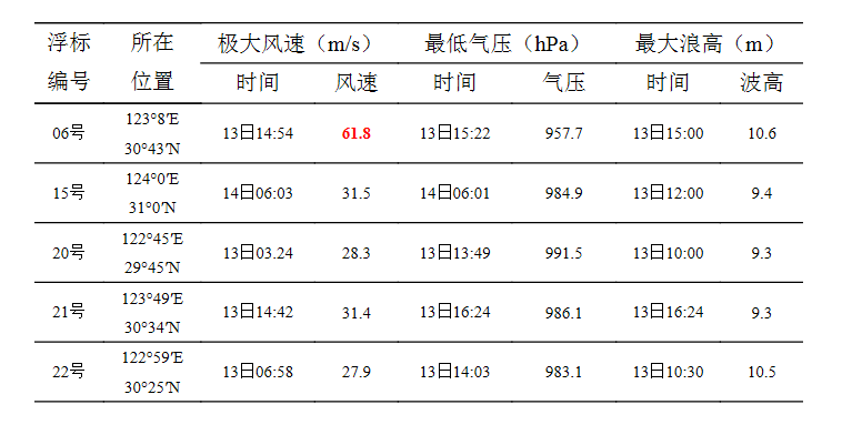 2021年9月13至16日,今年第14号强台风“灿都”从南向北穿过东海,并在上海临港新城以东海面陷于停滞。在此期间,中国科学院近海海洋观测研究网络东海海洋观测研究站共计5套浮标系统先后获取到“灿都”台风过境期间的实时观测数据(表1)。位于东海海礁附近的06号浮标获取到极大风速为61.8m/s(注1:17级以上超级台风,也可称为18级;根据我国2012年6月发布的《风力等级》国家标准,17级的最大值为61.2 m/s,超过这个值国际航海界普遍称为18级,例如1973年琼海发生的台风,中心附近最大风力为73 m/s,已超过17级的最高标准,称之为18级。注2:风速风向传感器的观测范围是0.0~100.0m/s),最低气压为957.7hPa,台风过境期间的最大浪高高度达到10.6m,其中17级以上台风更是东海海洋观测研究站以及中国近海观测研究网络组网以来观测风速之最。
