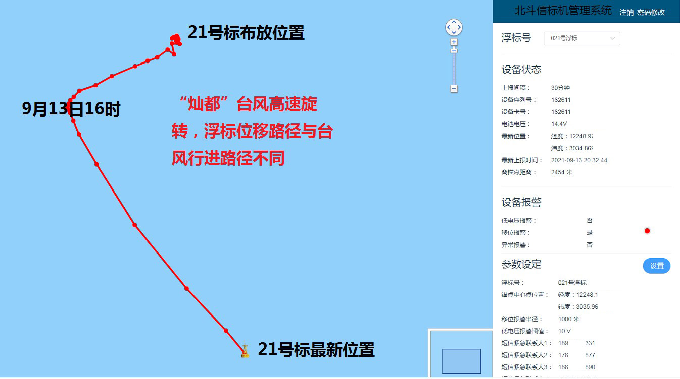 本次“灿都”台风结构密实,核心云团紧密、高速旋转,台风眼清晰细小,是个短小精悍的“子弹型”台风,可快速加强又快速减弱,对浮标的破坏力极强,在此期间东海海洋观测研究站21号浮标因受台风影响多次发生移位(如图1所示),且移位方向和台风的整体运行方向不同,这同时证明了“灿都”台风高速旋转的特点。另外,由于今年05月份对东海海洋观测研究站06号浮标应急大修时将浮标锚系进行了强化升级,确保了06浮标在经历17级以上台风情况下仍能安全在位运行。
