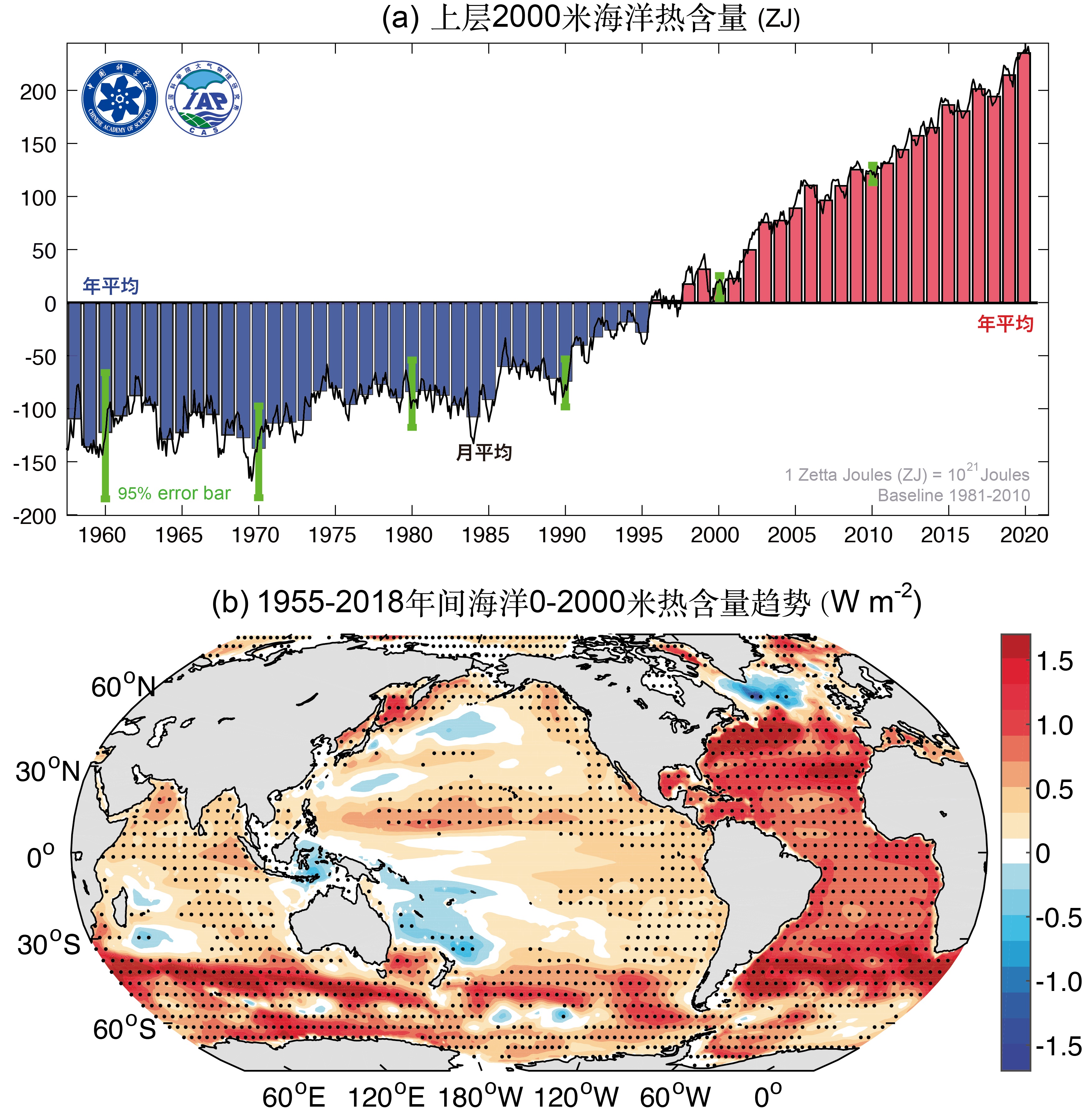 1955-2018年全球海洋上层2000米平均热含量变化
