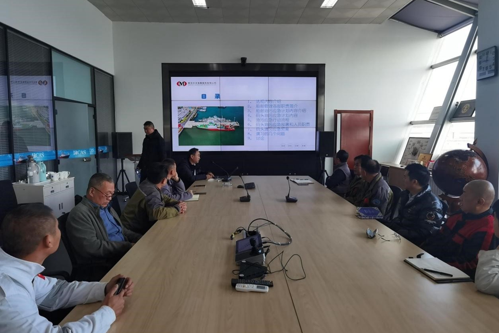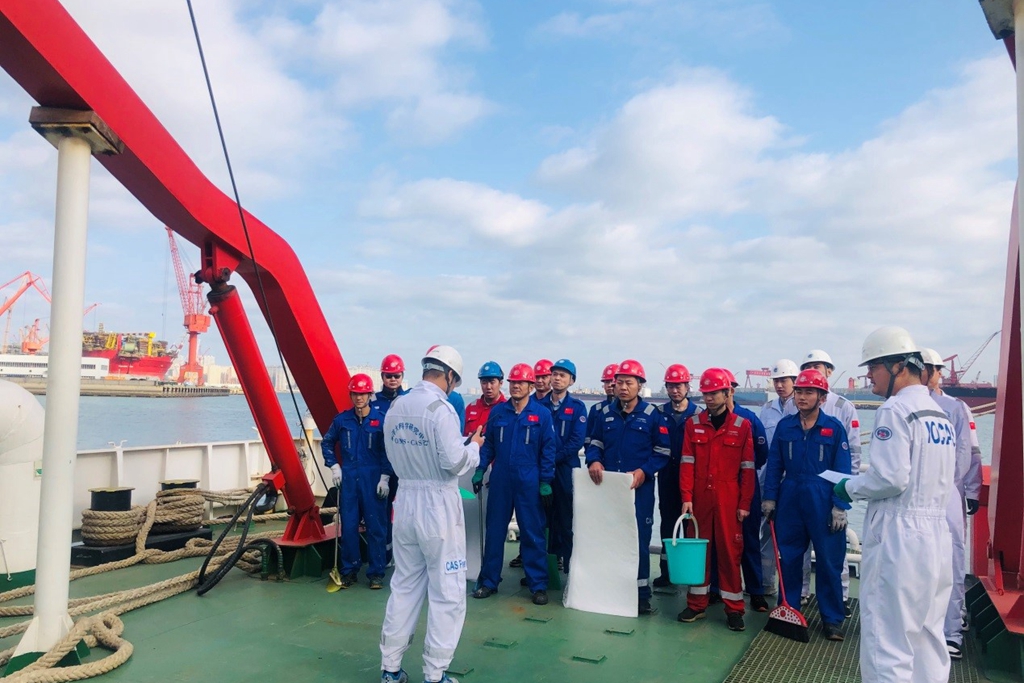 于云刚船长从法规要求、船舶管理部门职责、船舶油污应急计划、油污应急行动流程等九方面做了讲解。船舶运维部、工程技术部、园区物业及“科学三号”、“创新二”号工作人员参加培训。