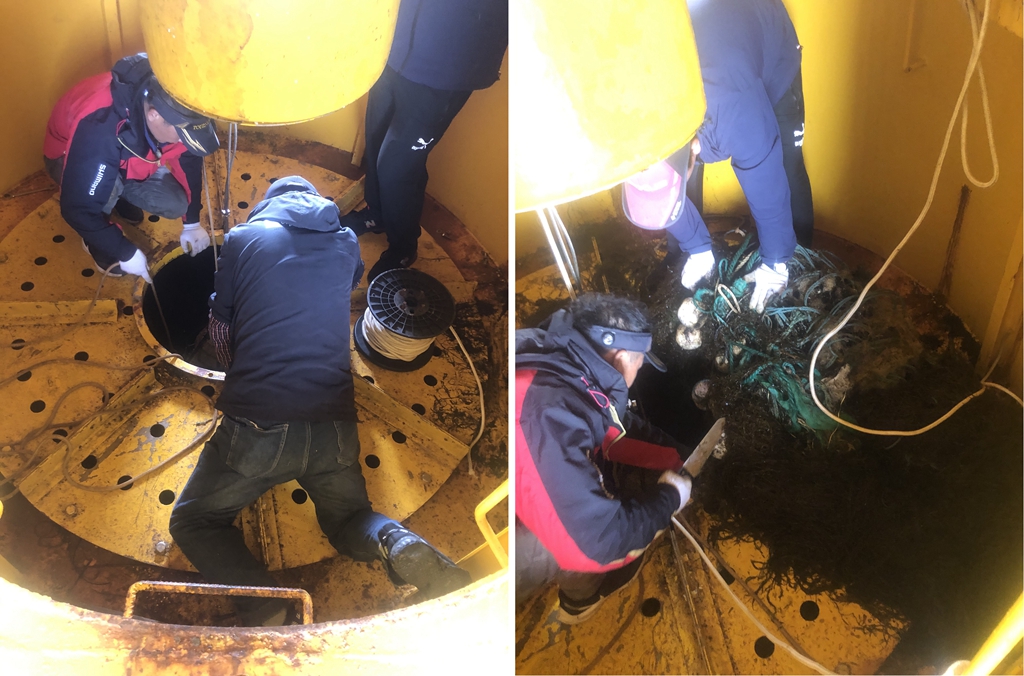 工作人员对三锚平台剖面系统进行应急抢修并清理中心井缠绕的渔网
