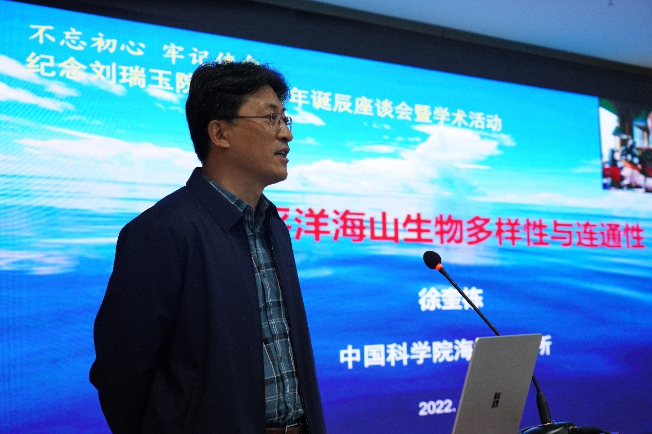 为更好的传承和发扬刘瑞玉院士精神财富,座谈结束后举行了纪念刘瑞玉院士百年诞辰学术活动,海洋所李新正研究员作“甲壳动物最新分类系统”报告,徐奎栋研究员作“西太平洋海山生物多样性与连通性”报告,科研人员围绕最新科研进展进行了交流研讨。