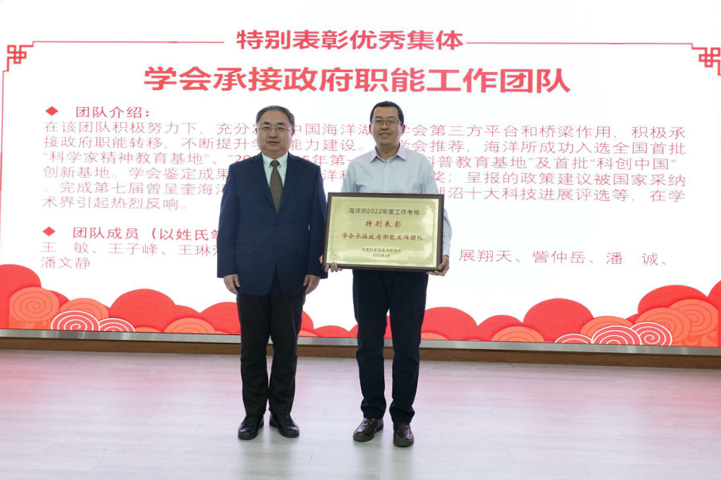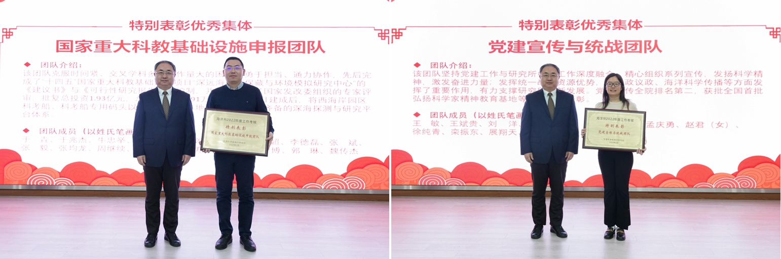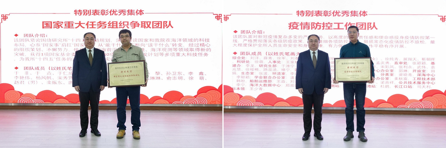 会上宣读了研究所2022年度重大成果、获得所外各类荣誉奖项以及年度考核优秀集体和个人的通知,对获奖集体和个人进行了表彰,并公布了海洋所2022年度十件大事评选结果。