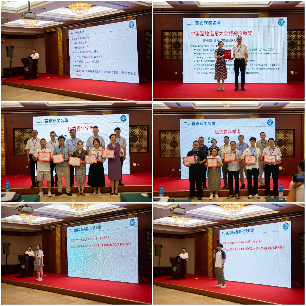 大会闭幕式对本次盛会进行总结,宣布 “中国湿地遥感大会特别贡献奖”(1人),“中国湿地遥感优秀青年学者”(10人),研究生“最佳报告奖”(28人)和“优秀报告奖”(35人)的获奖名单。特别贡献奖获得者柯樱海教授(首都师范大学)、优秀青年学者获奖代表贾明明副研究员(中国科学院东北地理与农业生态研究所)以及研究生最佳报告奖代表肖涵同学(中山大学)和优秀报告奖代表郑晓菡同学(中国科学院空天信息创新研究院)发表获奖感言。