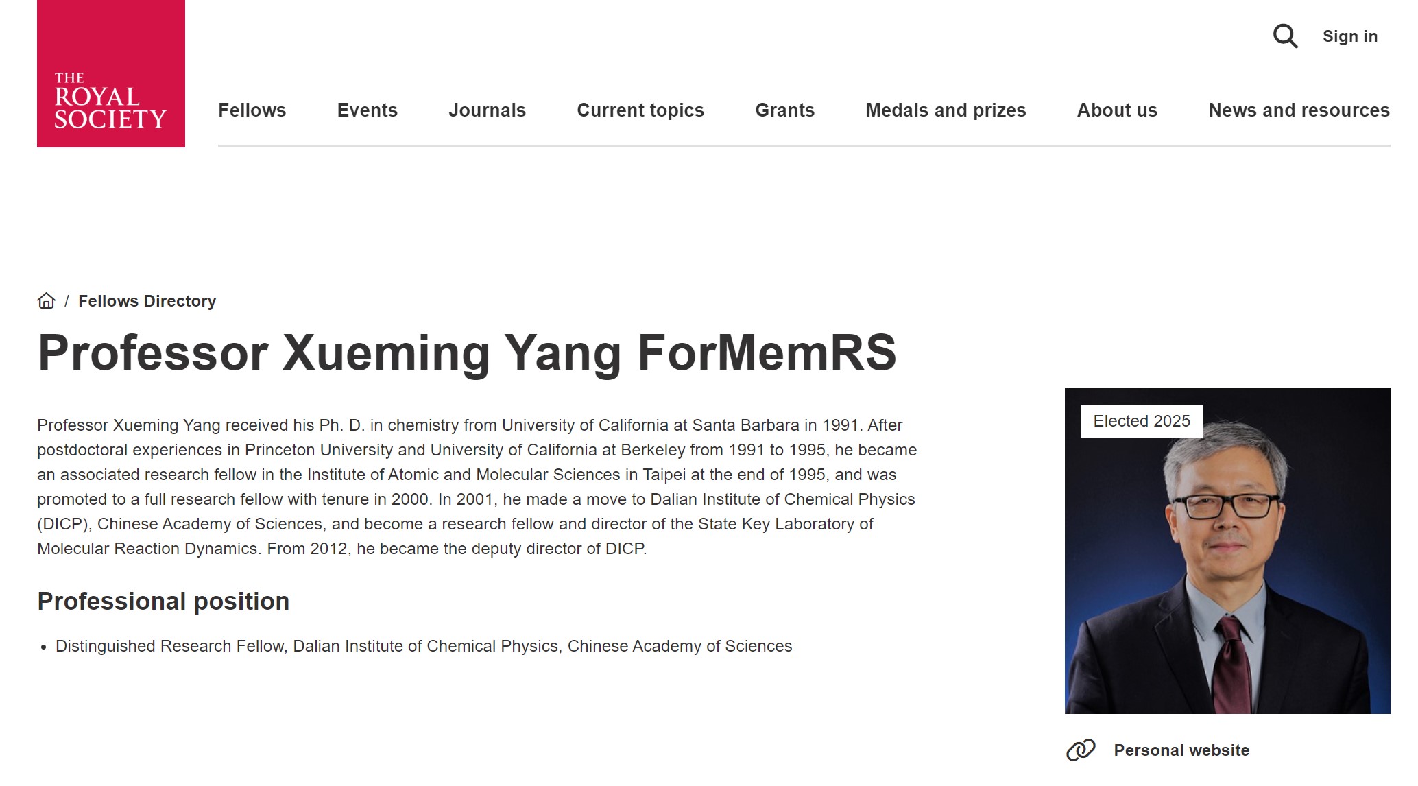 5月20日,英国皇家学会(The Royal Society)官方网站公布了2025年度新增选的70位院士、1位荣誉院士和24位外籍院士名单。大连化物所杨学明院士当选英国皇家学会外籍院士(Foreign Membership)。